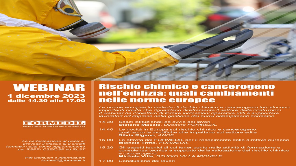 Si terrà il 1° Dicembre 2023 alle ore 14.30, sulla Piattaforma ZOOM, un webinar dal titolo "“Rischio chimico e cancerogeno nell’edilizia: quali cambiamenti nelle norme europee”, dove verranno illustrate le indicazioni operative utili a supportare lavoratori ed imprese nella gestione dei nuovi adempimenti normativi in materia.