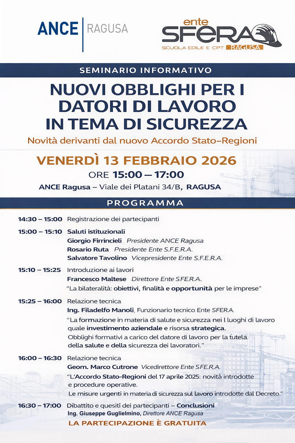 Seminario informativo sui nuovi obblighi per i datori di lavoro in materia di sicurezza – Nuovo Accordo Stato-Regioni – Ragusa 13 febbraio 2026 ore 14:30